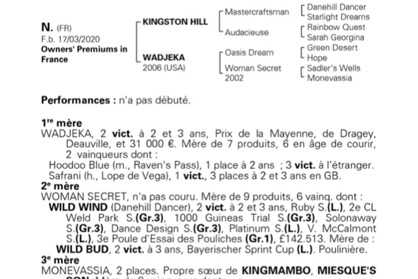N. 20 WADJEKA est une pouliche pur sang anglaise de 2 ans par KINGSTON HILL et WADJEKA (OASIS DREAM).