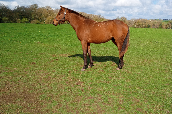 Pouliche juste débourrée, puis remise au près pour croissance, famille obstacle tardive.