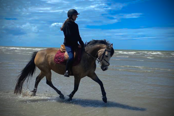 Ponette très attachante et proche de l'homme. Sort actuellement en E2 (1m). C'est une ponette "maitre d'école", sur le plat adapté pour tous niveaux, polyvalent sur un grand nombre de disciplines. Sort seulement en CSO, mais possibilté de faire du dressage. En effet, elle déroule très bien la reprise de dressage des VETP. A l'obstacle il faut un cavalier confirmé qui sait ce qu'il fait. Ponette avec beaucoup de sang. Sort en balade seule ou accompagné.